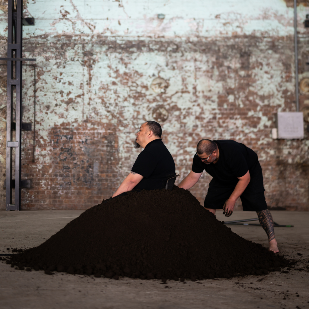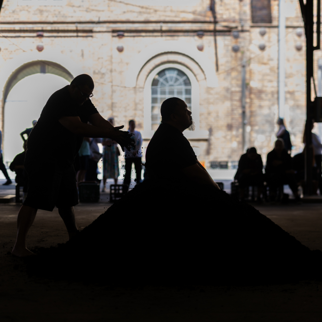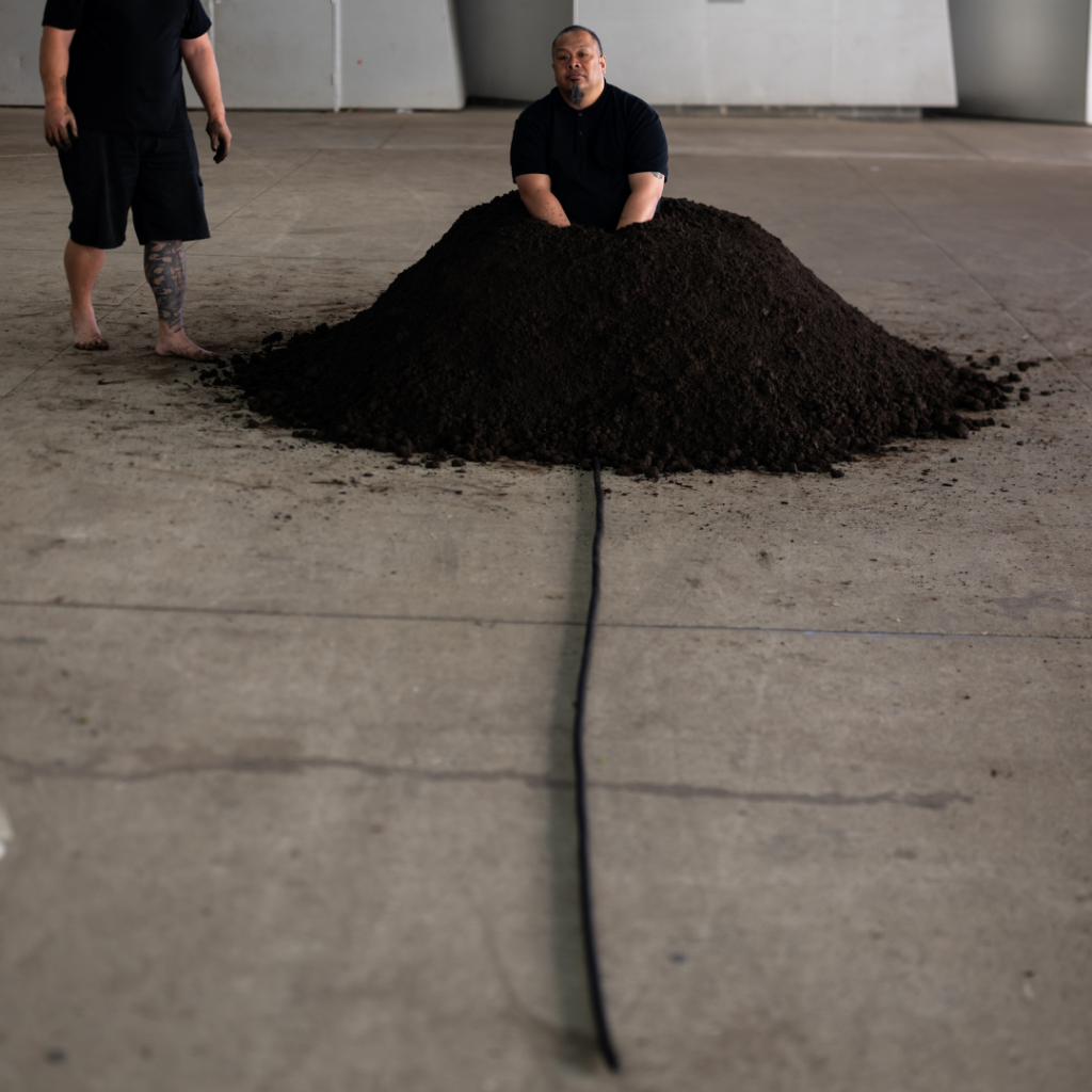At Sydney Contemporary, ‘Uhila presented Kelekele Mo’ui (Living Soil). This work explores the relationship between land, labour, and life, drawing on the Tongan words kelekele (soil, earth, ground) and mo’ui (life, living). The day-long performance work involves ‘Uhila sitting still while buried up to his neck in a pile of soil. The work contrasts moments of intense physical exertion with the stillness of maumau-taimi—a concept translated as “wasting time”—to question the value systems shaping our understanding of productivity, gender, and the body. Through sustained engagement with the elemental qualities of soil—its texture, weight, and scent—‘Uhila affirms the ground as both a site of sustenance and a register of lived experience.
